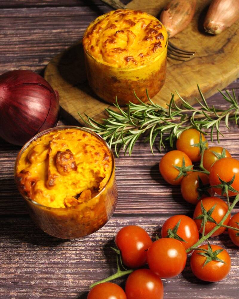 Das veganes Linsenragout in kleine ofenfeste Förmchen füllen, mit der Kürbismasse abdecken und für ca. 15 Minuten in den auf 200 Grad vorgeheizten Backofen geben.