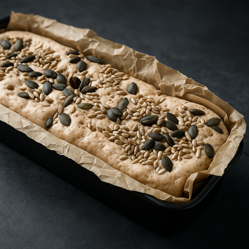 Alle Zutaten vermengen und mindestens 1 Stunde abgedeckt ruhen lassen. Den Teig in eine mit Backpapier ausgelegte Kastenform geben.